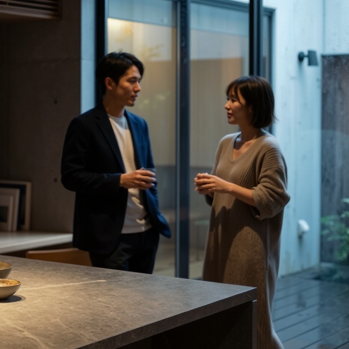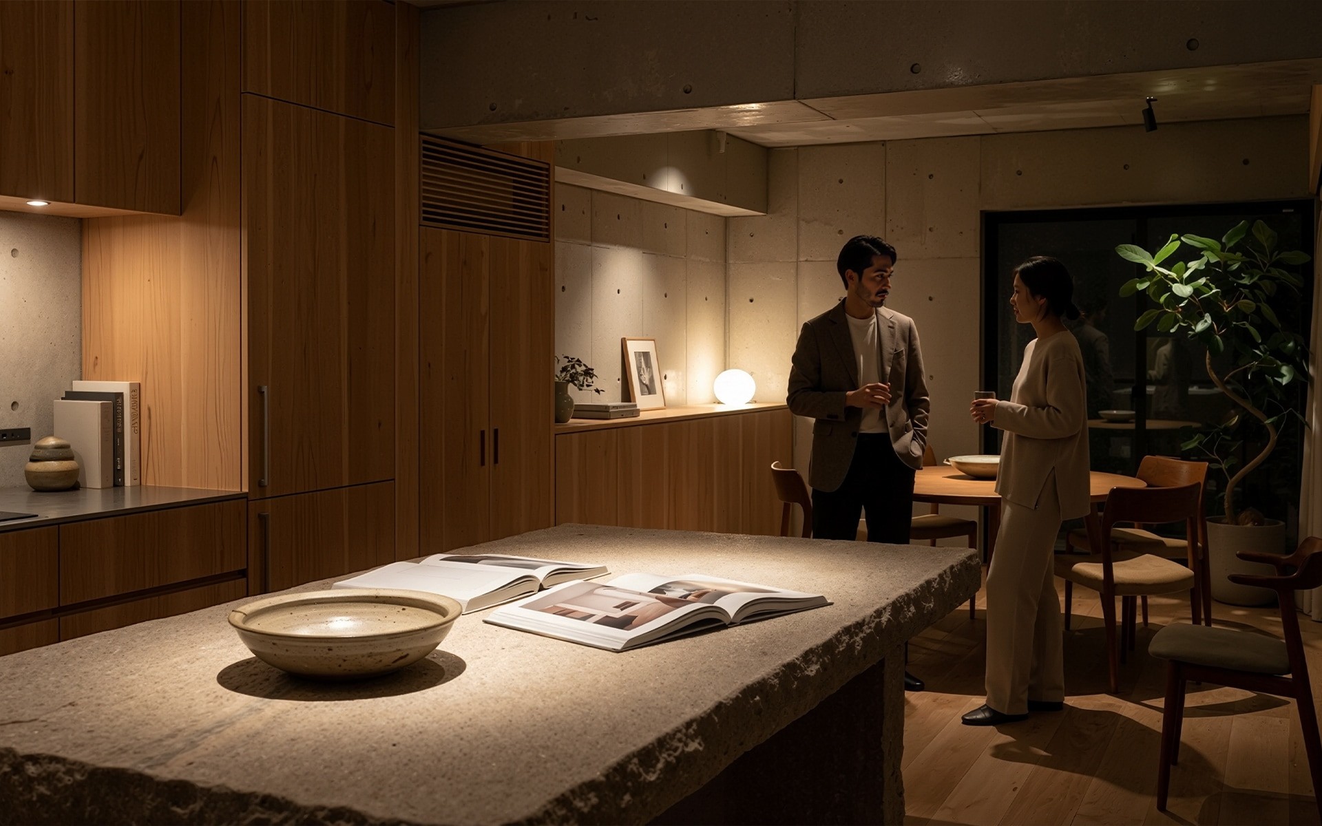 Its surface, illuminated by soft overhead lighting, becomes the heart of the home—used for cooking, sharing, reading, and conversation. The surrounding cabinetry in Japanese cedar contrasts gently with the cool stone, creating a beautifully warm balance.