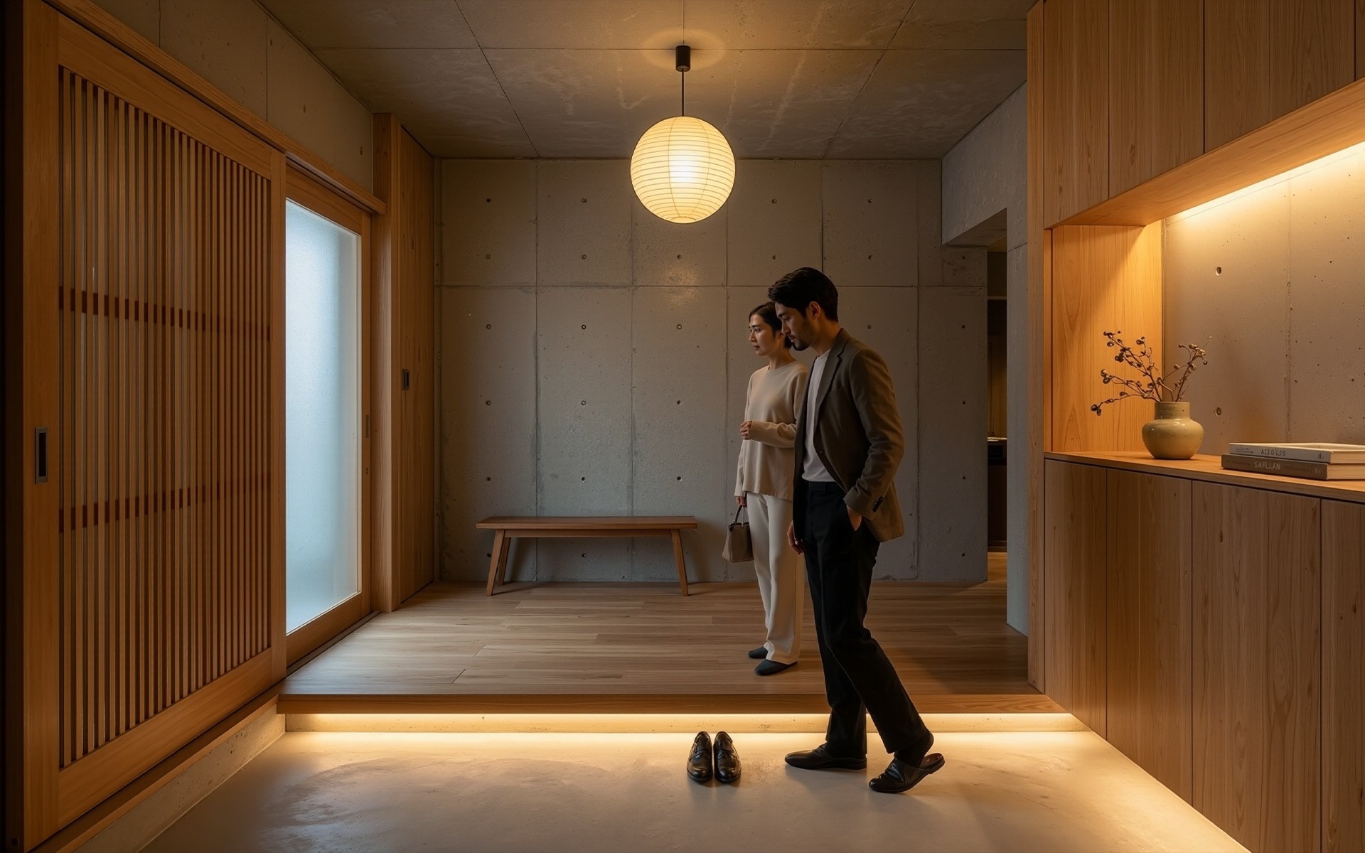 The entryway transitions from smooth stone flooring to warm timber platforms, creating a traditional yet modern threshold.