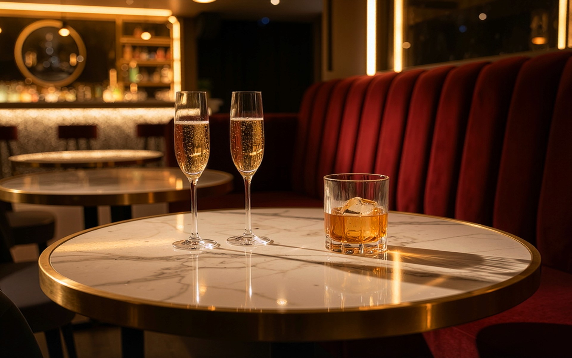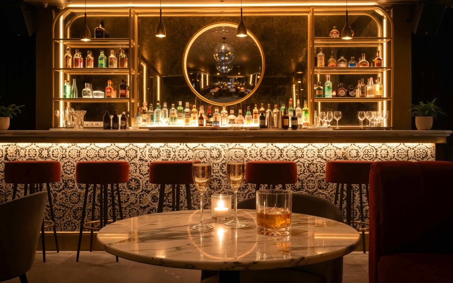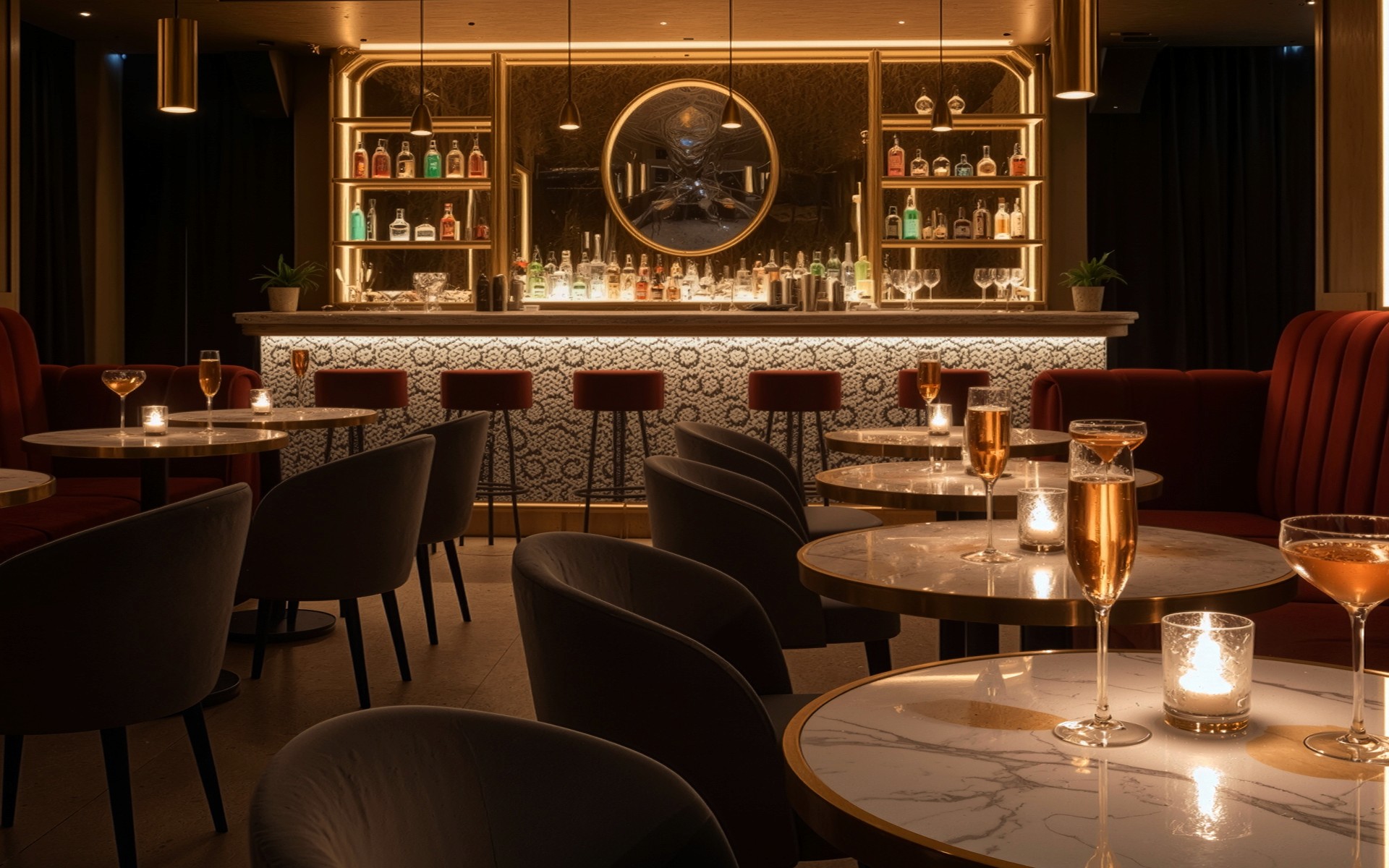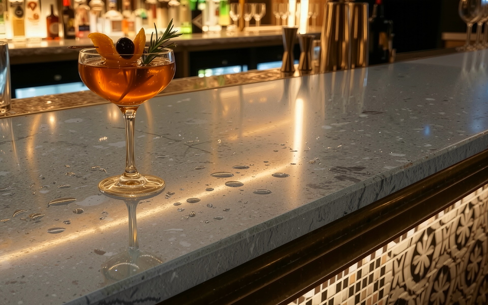 The bar is the heart of Luna Lounge. Its patterned stone façade and seamless countertop reflect the room’s golden glow, while the stone’s natural character adds depth beneath the lighting. The surface is engineered to be both durable and elegant, catching cocktail reflections like a mirror.
