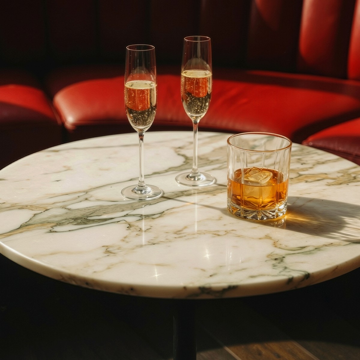 Each table features a circular marble slab framed with a brass edge. The veining adds movement to the dimly lit room, and every piece is cut and polished in-house by Lithos. These tables are intentionally weighty, solid, and stable enough for nightlife environments.