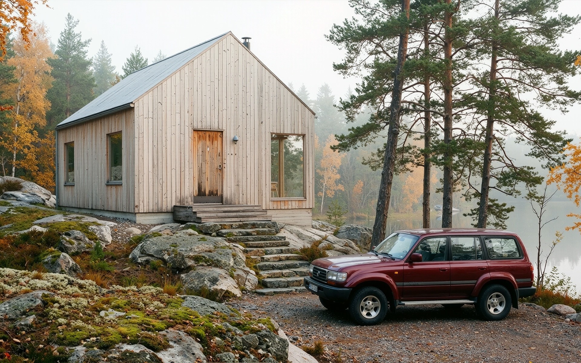 This off-grid Finnish cabin sits on a granite lakeshore surrounded by pine forest and seasonal color. Designed as a quiet escape from city life, the house blends untreated natural timber with rough stone surfaces and expansive glazing that frames the still water. Every detail reflects Nordic restraint and honest materiality.