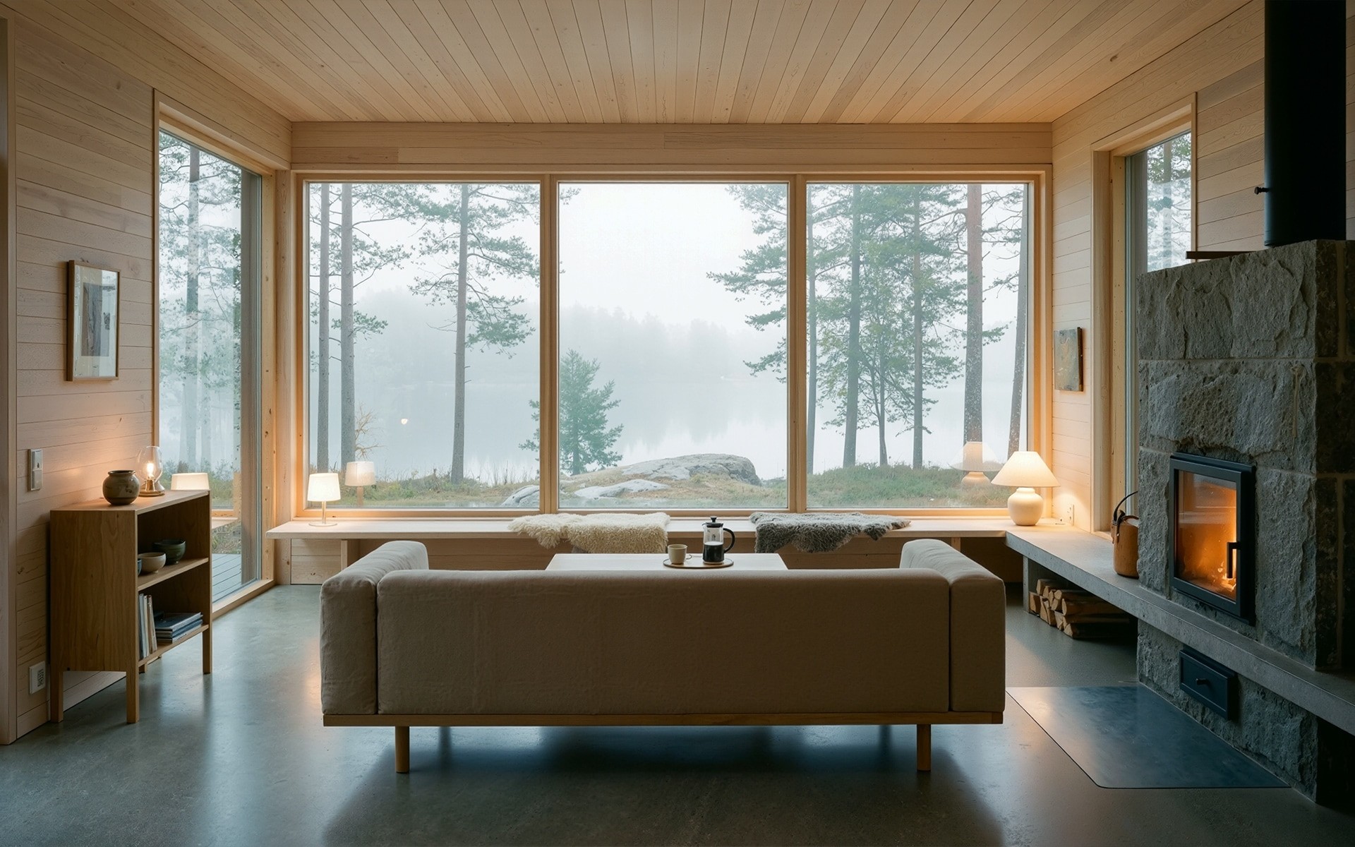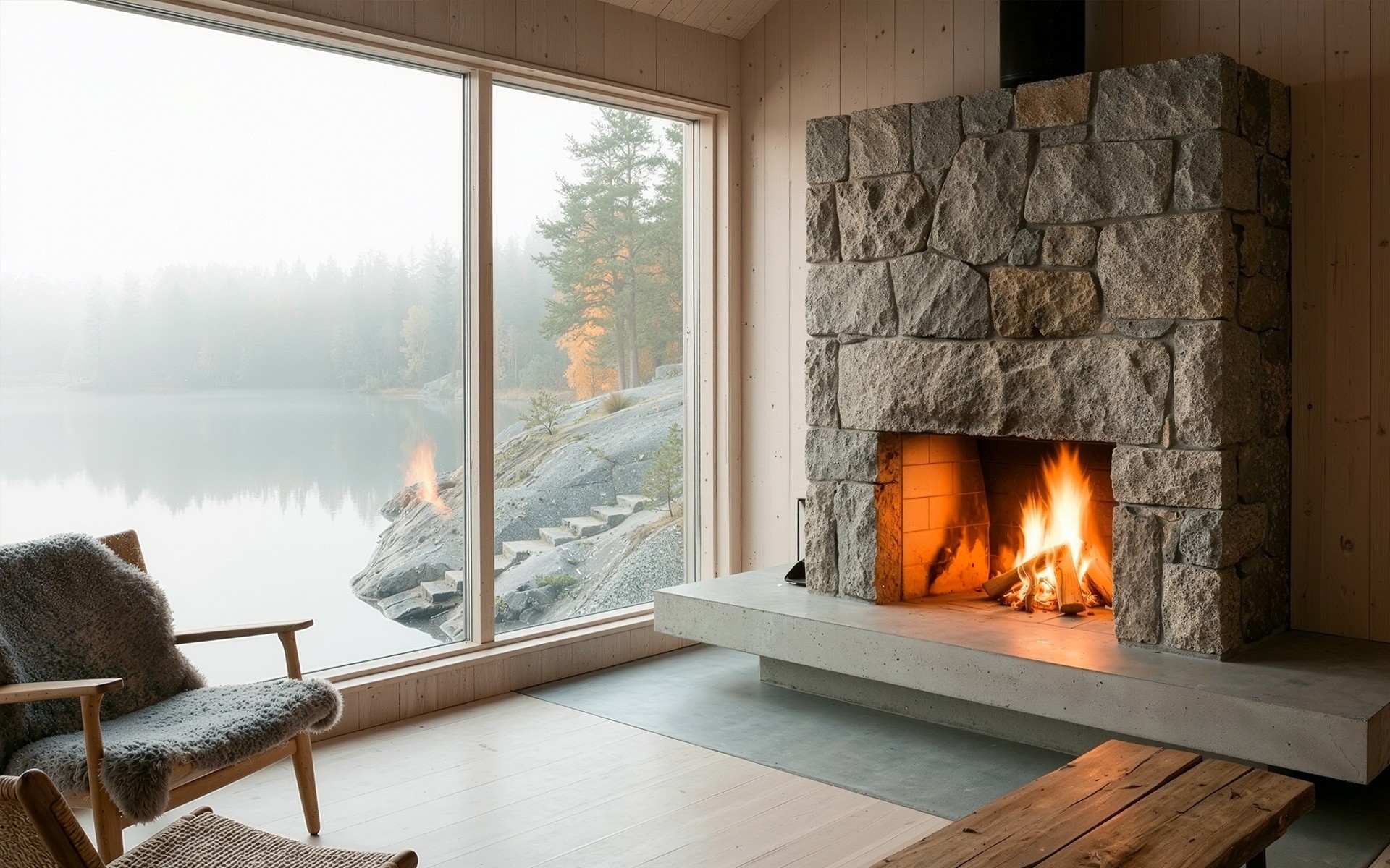 A sculptural stone fireplace anchors the living space, using the same granite language as the exterior. The fire’s warm glow blends with the cool morning light from the lake, creating the signature Nordic duality. Simple wooden furniture, wool textures, and long horizontal lines maintain a calm, timeless mood.