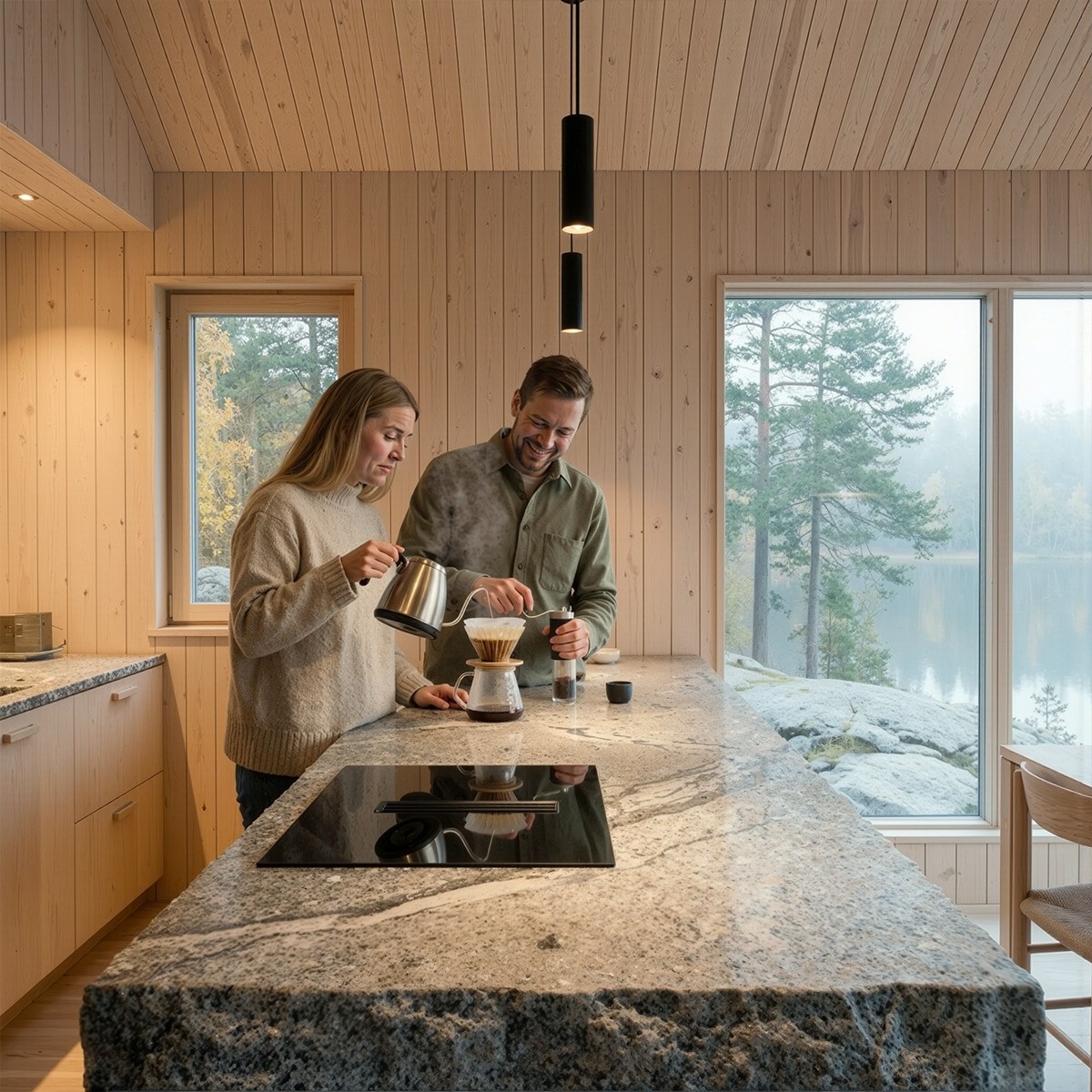 The kitchen is defined by a monolithic granite island carved from local stone. Its raw texture contrasts the warm, pale Finnish timber lining the walls and ceiling. Minimal black fixtures and hidden lighting create a soft, intimate atmosphere. Large windows look out to the lake, making the landscape part of the interior.