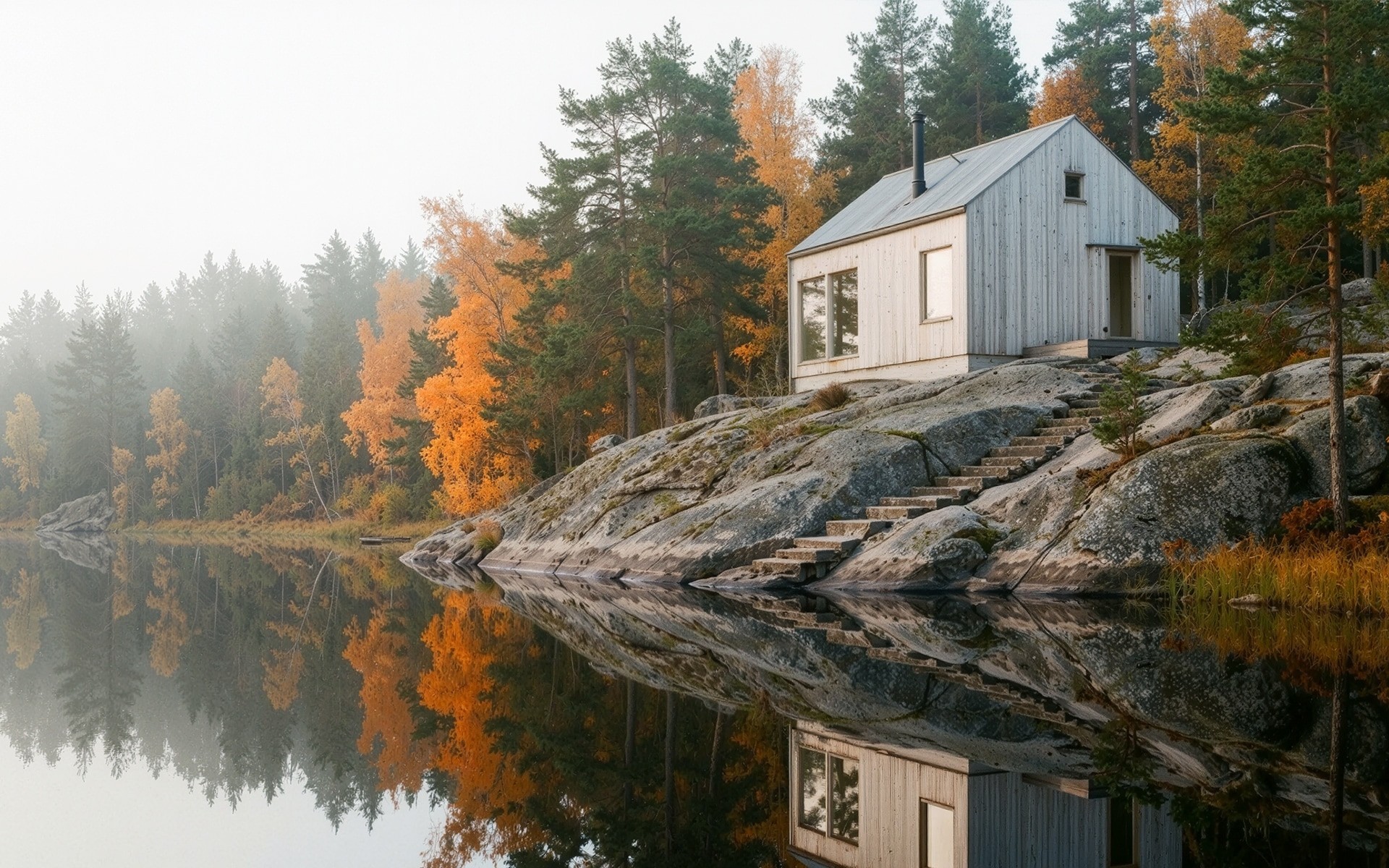 Designed for a couple seeking quiet, intentional living, the home prioritizes simplicity over excess. The rituals are modest—morning coffee by the lake, heating the fireplace, stepping onto bare rock. Everything reflects the values of Nordic slow living.