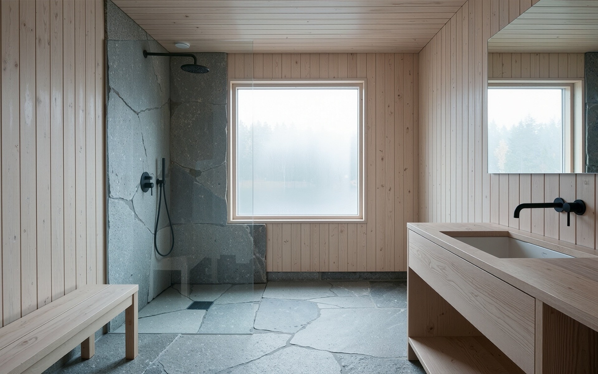 The bathroom embraces raw, carved granite slabs on the floor and shower walls. Pale wood, matte black fixtures, and a soft diffused window create a serene, sauna-like atmosphere. The interior feels almost carved from the surrounding landscape.
