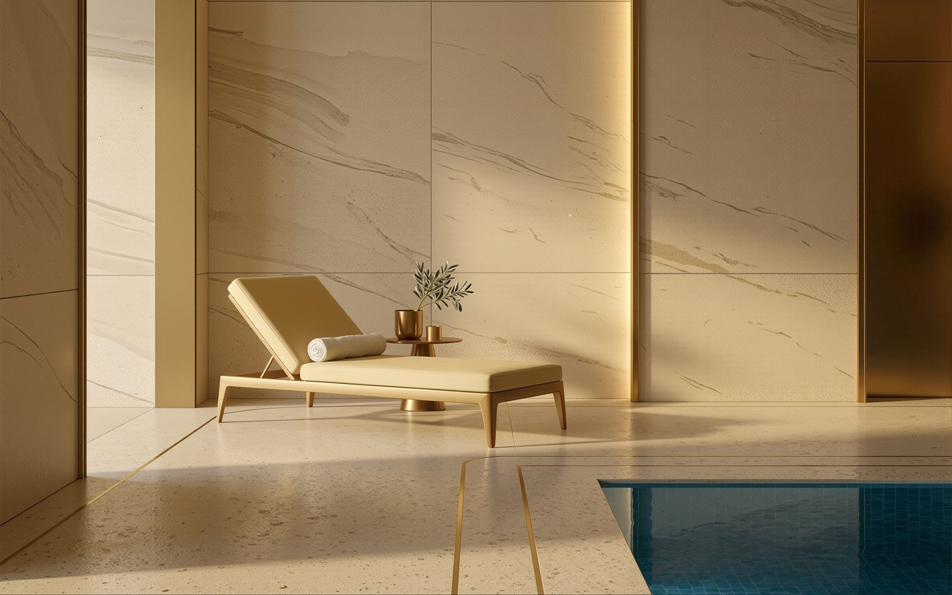 Throughout the lounge, Lithos provided stone slabs for flooring, side tables, and custom surfaces. Brass lines integrated into the stone floor guide circulation subtly, adding refinement without visual noise. The stone palette blends naturally with soft furnishings, creating a calm desert-inspired aesthetic.