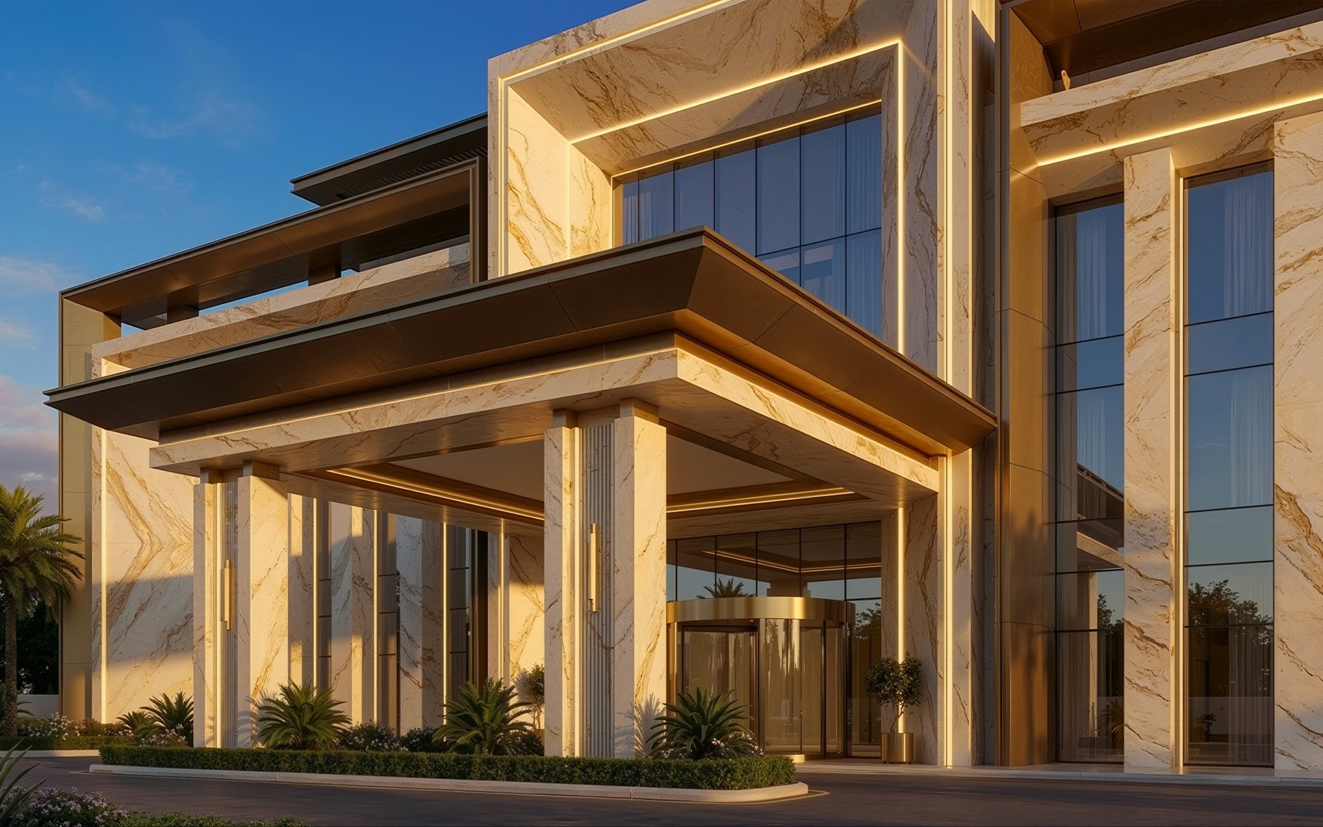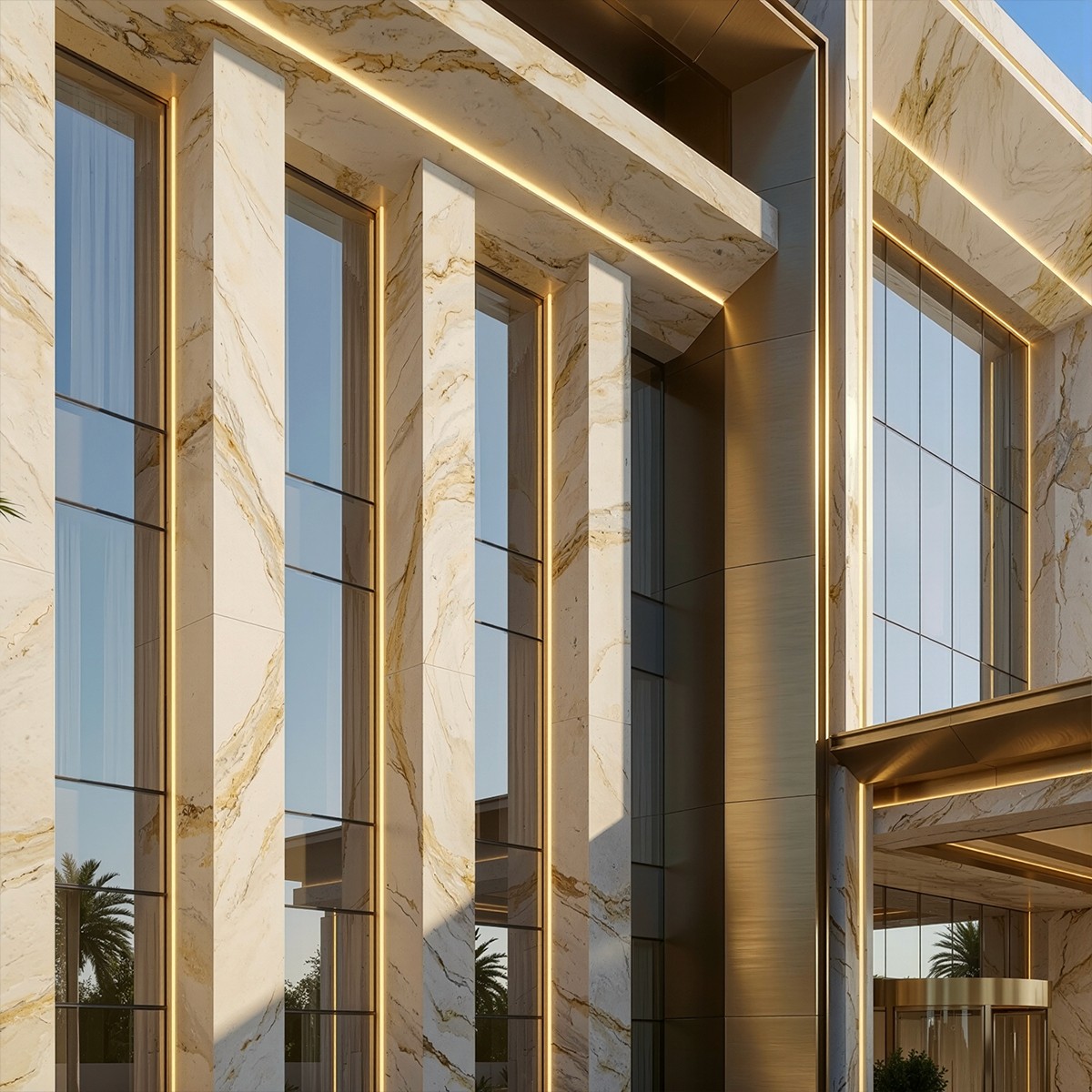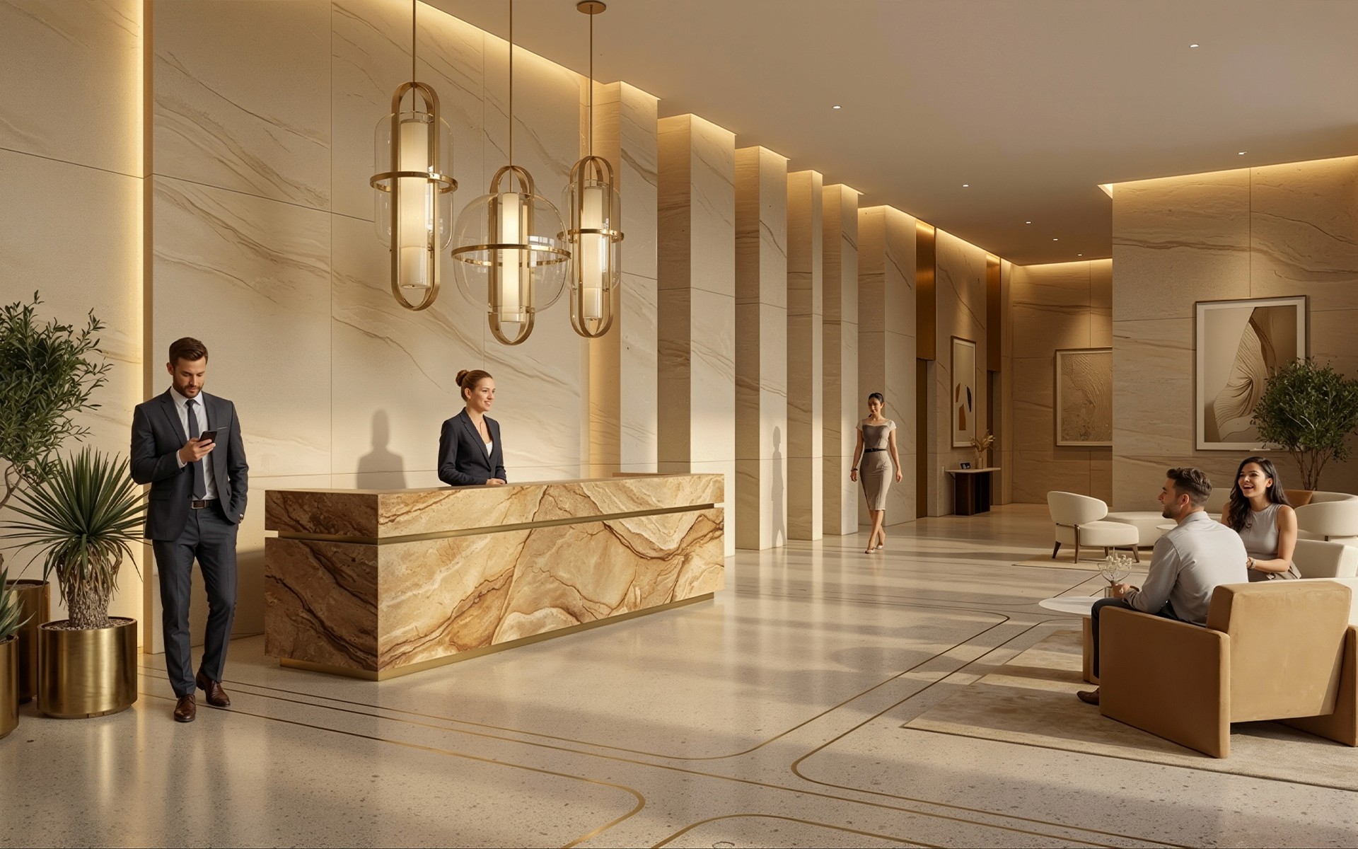 The large-scale columns are engineered from carefully matched stone panels, each chosen for color harmony and structural consistency. These columns bring height and presence to the lobby, echoing the grandeur of regional architecture while maintaining a contemporary edge.