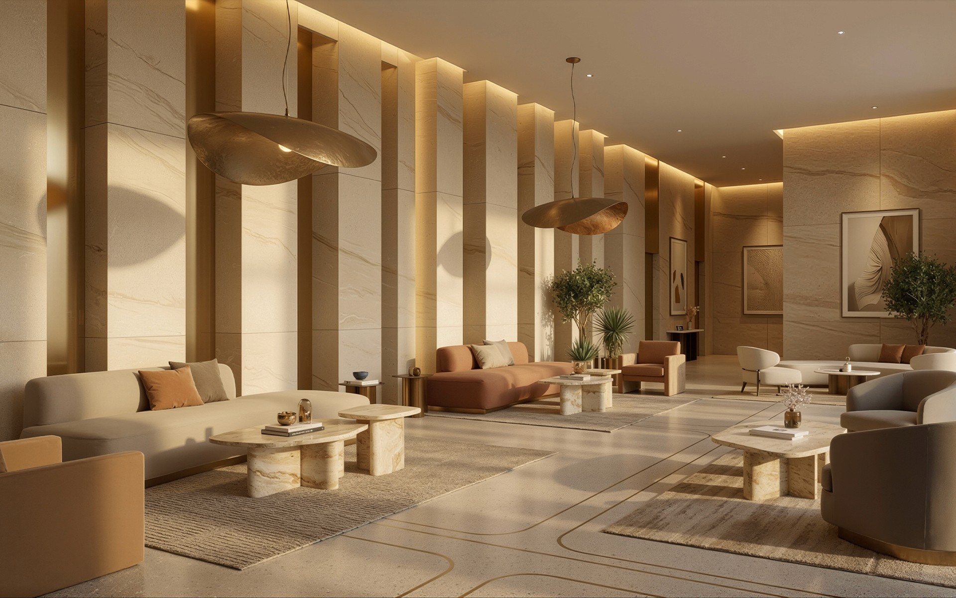 The reception desk acts as the hotel’s anchor piece: a massive block of warm desert stone, meticulously cut and finished to appear seamless. Soft golden light washes over its surface, highlighting the stone’s mineral patterns. This desk sets the tone for the entire visitor experience—minimal, elegant, and grounded.